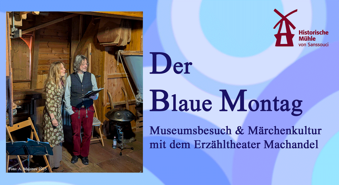![]() Der Blaue Montag in der Historischen Mühle: Museumsbesuch & Märchenkultur! "Der Müller & die Liebe zur Luft" Märchen von Wind, Flügeln und Aussichten Historische Mühle von Sanssouci Maulbeerallee 5 14469 Potsdam www.historische-muehle-potsdam.de Tickets für den Blauen Montag sind an der Kasse der Historischen Mühle erhältlich. Info/Reservierungen: 0331 - 55 06 851 Eintritt: 15€/12€ Die Historische Mühle ist nicht barrierefrei. Der Blaue Montag eignet sich für Zuhörende ab 16 Jahren. |
