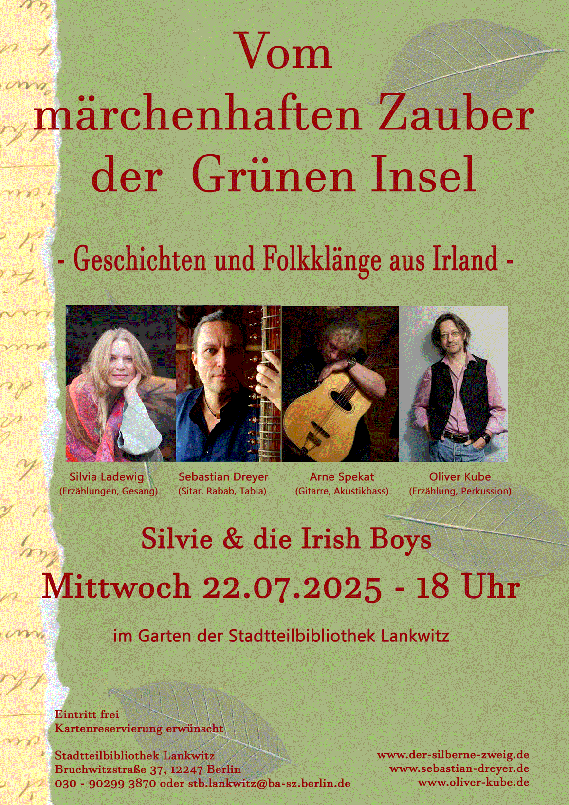 "Vom märchenhaften Zauber der Grünen Insel " - - Geschichten & Folkklänge aus Irland erzählt und gespielt von Silvie & den Irish Boys Silvia Ladewig (Erzählung, Gesang), Sebastian Dreyer (Sitar, Rabab, Tabla) Oliver Kube (Erzählung, Percussion, Gesang) & Arne Spekat (Gitarre, Akustikbass) Stadtbibliothek Lankwitz Bruchwitzstraße 37, 12247 Berlin Anmeldung/Information über: (030) 90299 3870 oder stb.lankwitz@ba-sz.berlin.de https://www.berlin.de/stadtbibliothek-steglitz-zehlendorf/bibliotheken/stadtteilbibliothek-lankwitz/ |
