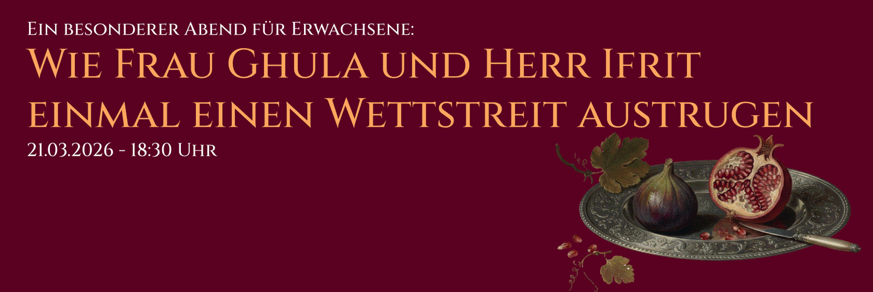 "Wie Frau Ghula und Herr Ifrit einmal einen Wettstreit austrugen" 1001 Märchen aus Lampe und Flasche im Rahmen der Internationalen Woche gegen Rassismus 2026 KulturDIELE M8 Mönchstraße 8 18439 Stralsund https://kulturdiele-hst.de/veranstaltungen Eintritt 20 Euro / ermäßigt 16 Euro Tickets können online reserviert werden oder sind bei Juwelier Stabenow, Badenstraße 1, Stralsund erhältlich |
