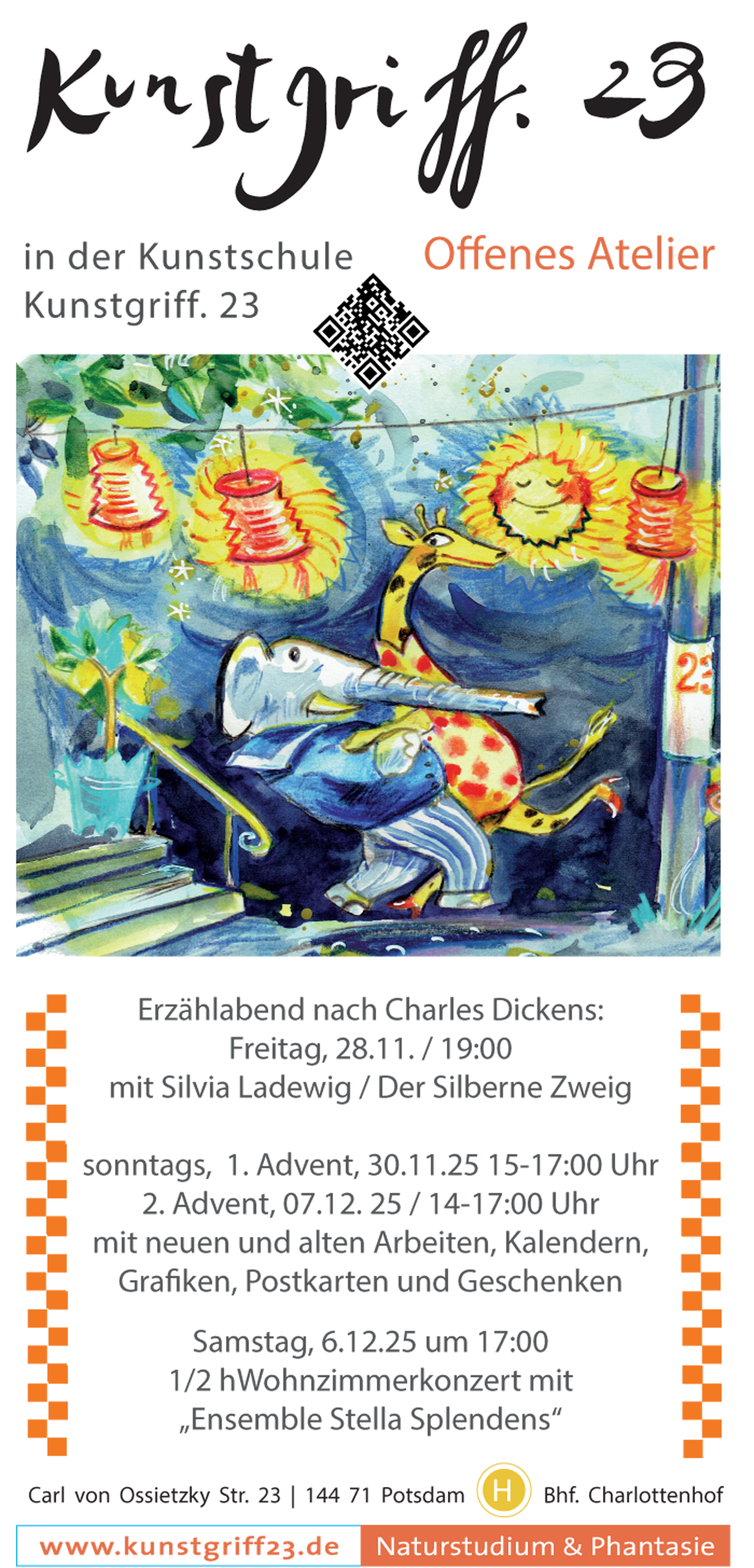 Zum 2. Advent im Kunstgriff 23 "Weihnachtliches Musizieren im Atelier" Mit Ensemble Stella Splendens (Arne, Oliver, Sebastian & Silvie) Kunstgriff 23 Carl-von-Ossietzky-Straße 23 14471 Potsdam Anmeldung nicht nötig, Infos im Kunstgriff 23 bei Frau Isenmann: (0)331 – 505 373 5 oder kontakt@kunstgriff23.de, www.kunstgriff23.de |