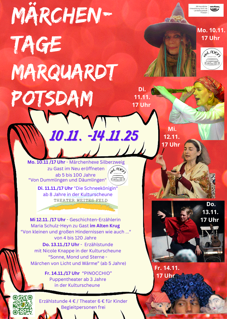 Märchentage Marquardt Märchenhexe Silberzweig hext Märchen von "Dummlingen und Däumlingen" Dorfladen & Café einLaden Hauptstr. 4 14476 Potsdam-Marquardt www.kulturscheune-marquardt.de Eintritt: Kinder 4, Begleitpersonen frei; Anmeldung nicht erforderlich |